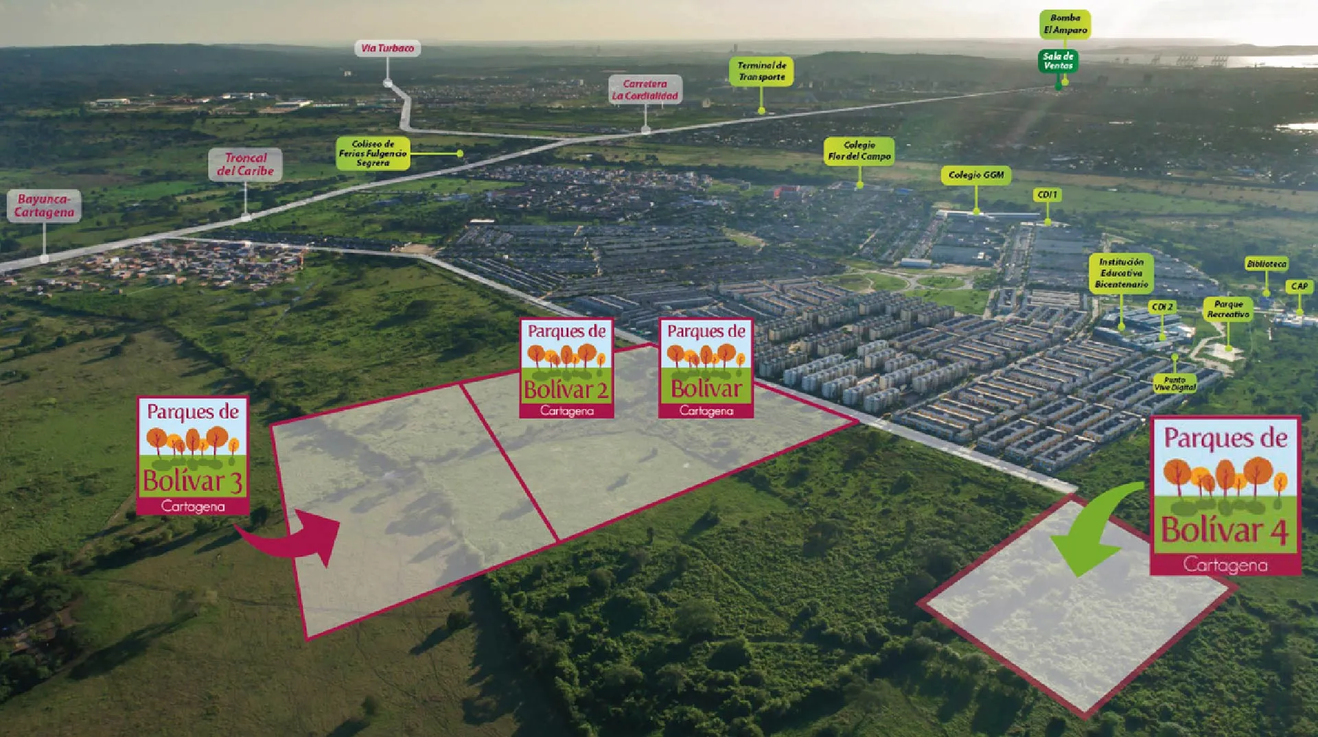 Parques de Bolívar Cartagena es un proyecto que hace parte de un desarrollo de casas en conjuntos cerrados que estarán rodeados de una amplia oferta de servicios y comercios que te permitirán tener todo en el sector; colegios, centros religiosos, centros de comercio y abastecimiento pensados en satisfacer las necesidades de todos los miembros de la familia. Se desarrolla en la manzana 23 de la Urbanización Ciudad del Bicentenario, localizada al nororiente de Cartagena, con vías de acceso como la carretera La Cordialidad - vía Barranquilla y la Troncal del Caribe.